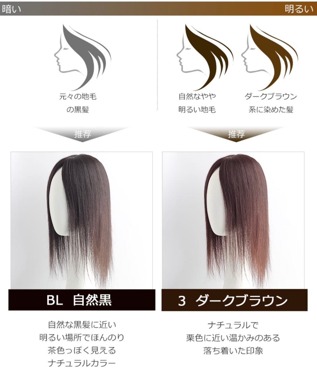 カラーにつきましては、ヘアピースの色より暗く染めることは可能ですが、明るく染めることはできませんのでご注意くださいませ。
