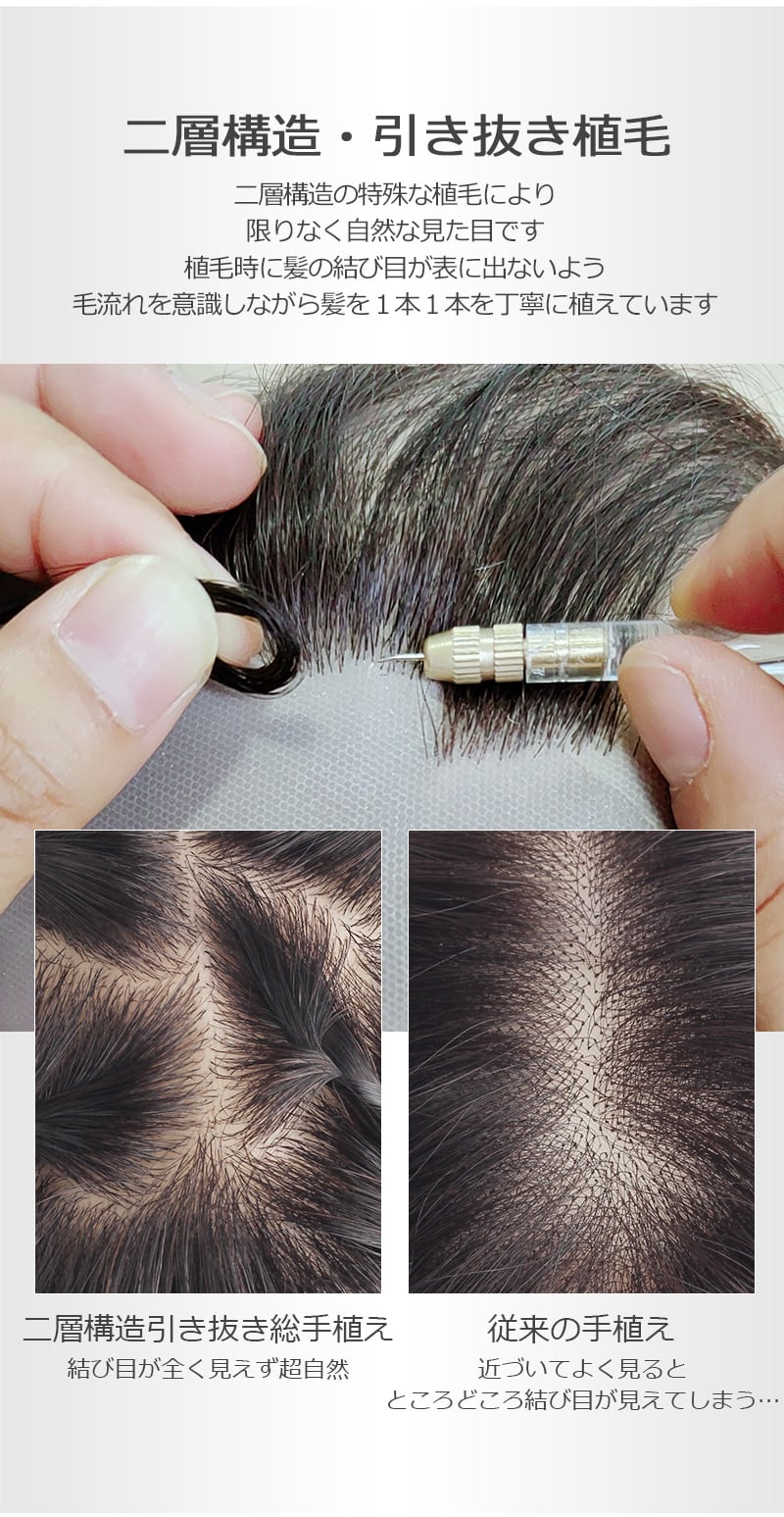 人毛100%、総手植え、通気性のいいベースを使用した部分ウィッグとなります。