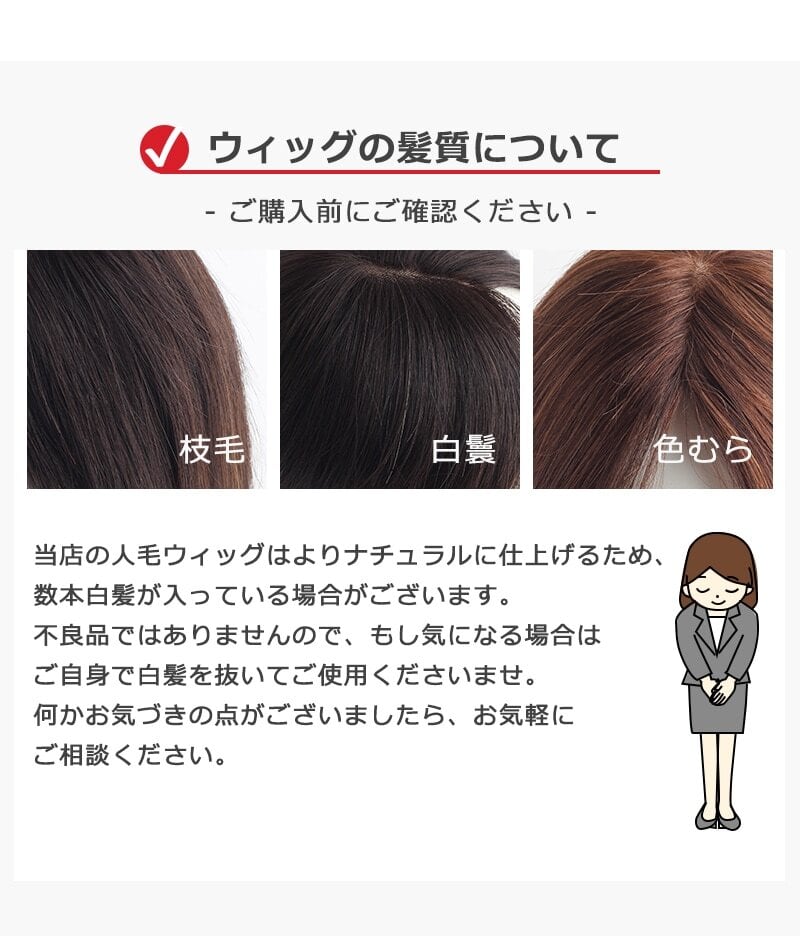 またセルフカラーのカラーリングは、カラー剤や染め方によってウィッグの髪が抜けてしまう危険がございますため、美容院でのカラーをおすすめしております。