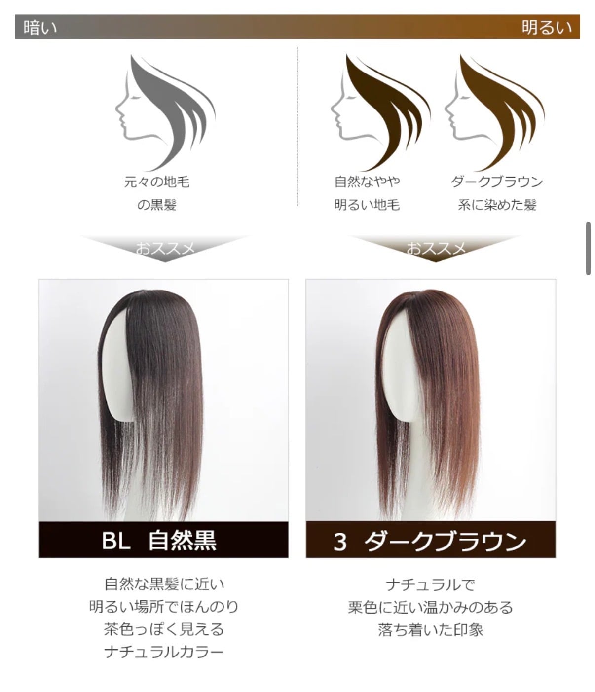 またセルフカラーのカラーリングは、カラー剤や染め方によってウィッグの髪が抜けてしまう危険がございますため、美容院でのカラーをおすすめしております。